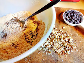 Add the Wet Mix to the dry mix and stir with a spoon. Then add the chocolate chips and nuts (if using).